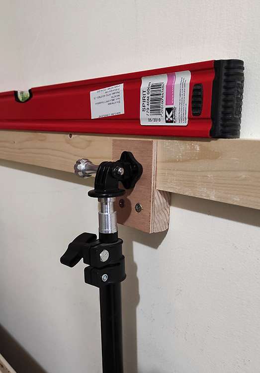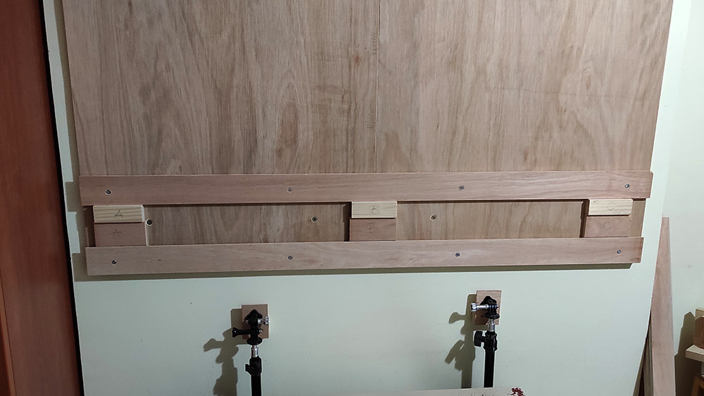 Za horizontalno poravnanje i lakšu montažu napravljena su dva nosača, kombinacija stalka za reflektore i pravouglih delova za akcionu kamericu i dodatih L profila od drveta. sa desne strane, na postojecem plakaru je dodat još jedan drveni oslonac, tako da je montaža olakšana i precizna. Dve polovine panela su i privremeno za montažu povezane sa dve trake od tanke šperke tako da prelaz bude što manje vidljiv.