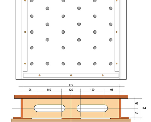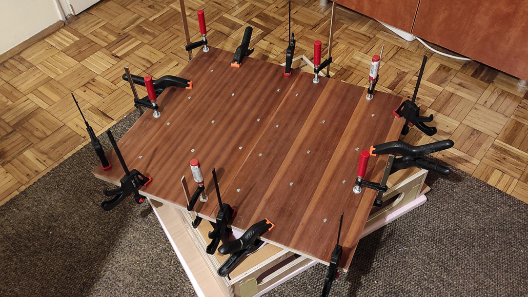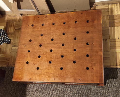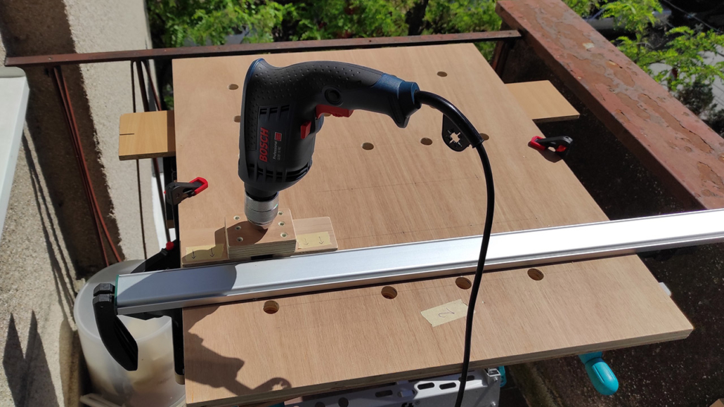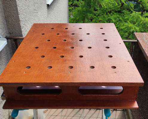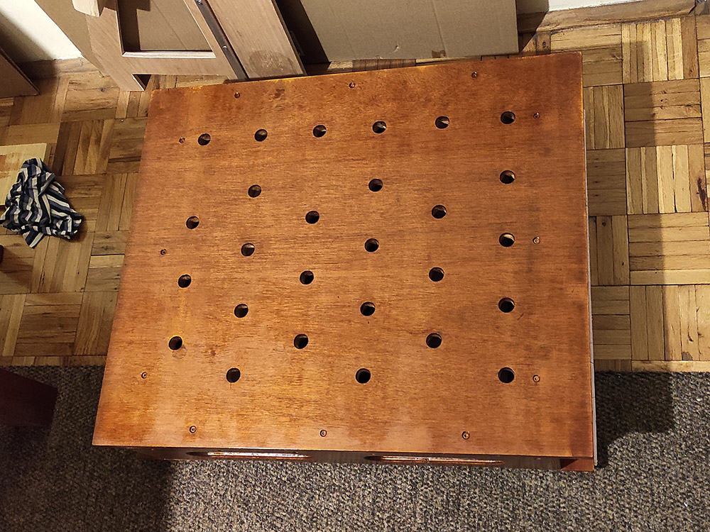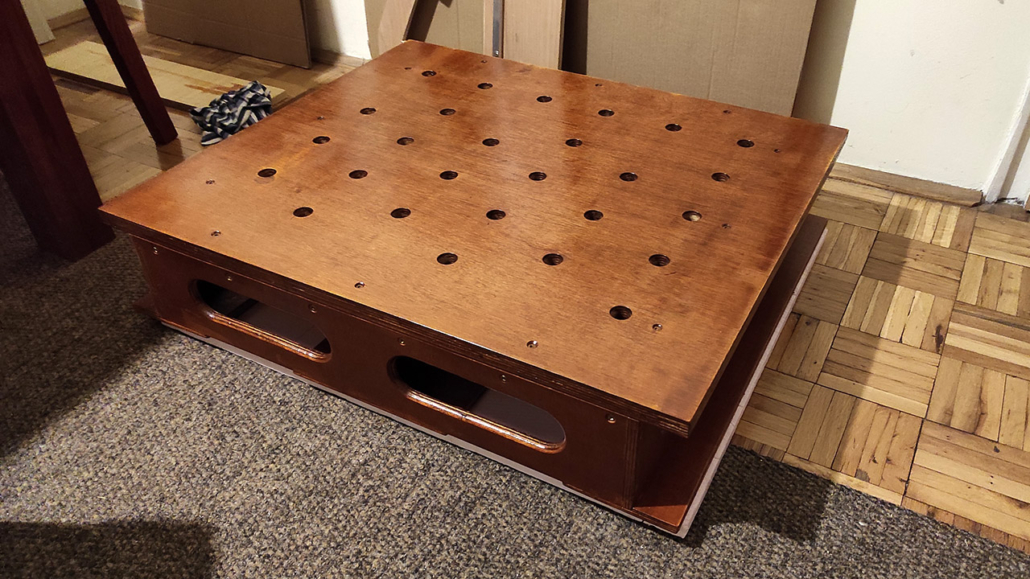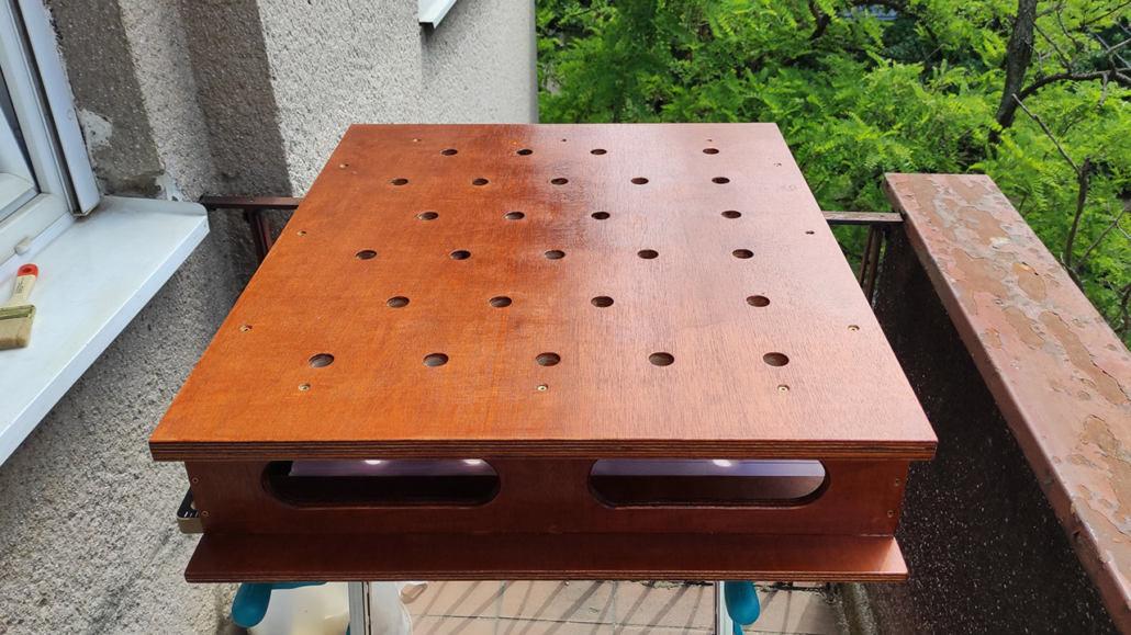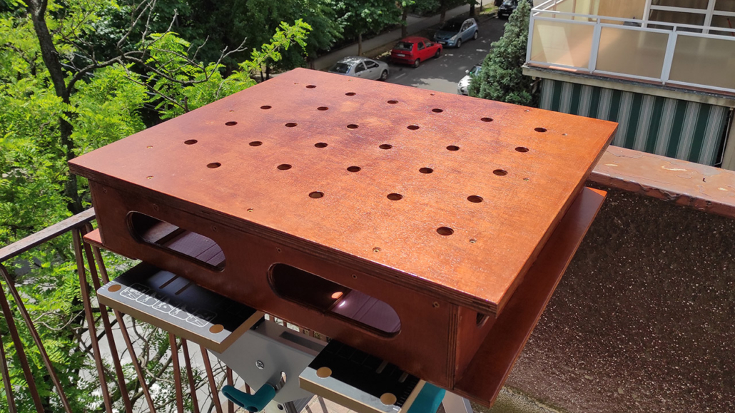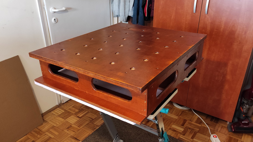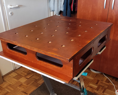 Radna ploča je od šperke u više slojeva veličine 60x80cm. Rupe su rasporedjene po španskom projektu (Domestika – Patricio Ortega – folder Domestika). Za bušenje napravljen šablon od šperke koji treba da drži vertikalnost burgije (kwb 20mm), na žalost od velikog zagrevanja šablon se raširio pa je dobar deo rupa neprecizan. Okvir je urađen kvalitetno od šperke 12mm visine 13cm sa rupama za olakšanje (primeri sa YT) i tri podloge koje su obložene finom gumenom oblogom (mouse-pad).