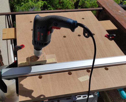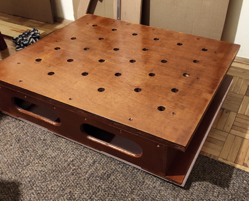 Konačno sto je jak, stabilan, rupe 20mm se mogu delimično koristiti za manje alate. Neko vreme je manje korišćen kada se radi na terasi ili u predsoblju. onda je 2023 napravljena nova radna ploča od medijapana 18mm sa preciznim rupama 20/96mm po MFT standardima na CNC mašini. Okvir – postolje je zadržan jer je čvrst i precizan tako da se sada sto može koristiti za vrlo precizne poslove.